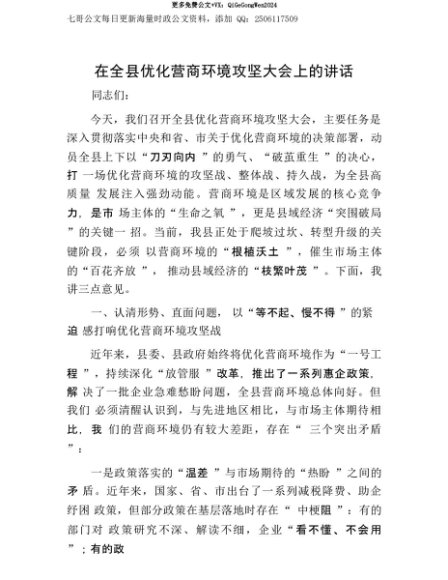 【七哥公文】2025年:【七哥公文】在全县优化营商环境攻坚大会上的讲话+更多免费公文+VX:QiGeGongWen2024+更多免费公文+VX:QiGeGongWen2024