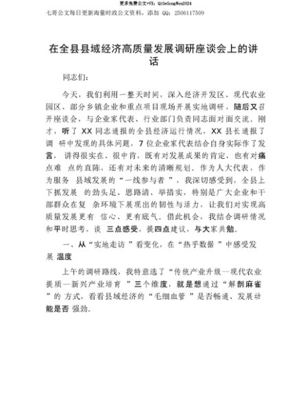 【七哥公文】2025年:【七哥公文】在全县县域经济高质量发展调研座谈会上的讲话+更多免费公文+VX:QiGeGongWen2024+更多免费公文+VX:QiGeGongWen2024