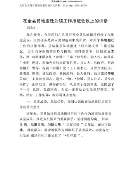 【七哥公文】2025年:【七哥公文】在全县易地搬迁后续工作推进会议上的讲话+更多免费公文+VX:QiGeGongWen2024+更多免费公文+VX:QiGeGongWen2024