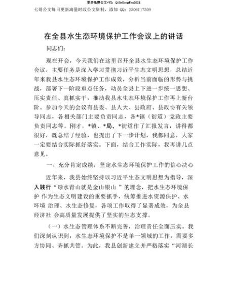 【七哥公文】2025年:【七哥公文】在全县水生态环境保护工作会议上的讲话+更多免费公文+VX:QiGeGongWen2024+更多免费公文+VX:QiGeGongWen2024