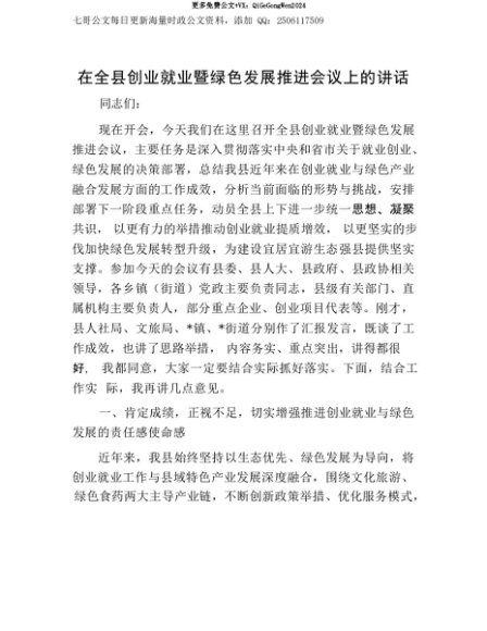 【七哥公文】2025年:【七哥公文】在全县创业就业暨绿色发展推进会议上的讲话+更多免费公文+VX:QiGeGongWen2024+更多免费公文+VX:QiGeGongWen2024