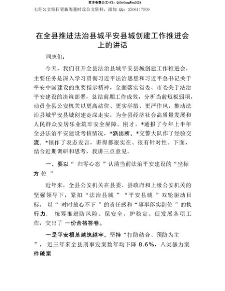 【七哥公文】2025年:【七哥公文】在全县推进法治县城平安县城创建工作推进会上的讲话+更多免费公文+VX:QiGeGongWen2024+更多免费公文+VX:QiGeGongWen2024