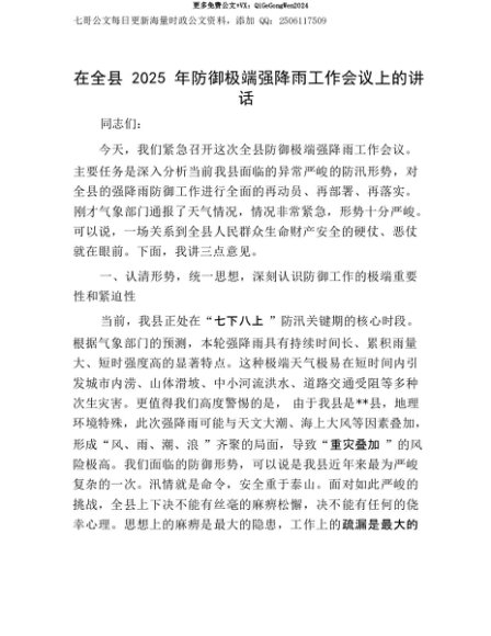 【七哥公文】2025年:【七哥公文】在全县2025年防御极端强降雨工作会议上的讲话+更多免费公文+VX:QiGeGongWen2024+更多免费公文+VX:QiGeGongWen2024