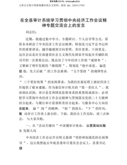 【七哥公文】2025年:【七哥公文】在全县审计系统学习贯彻中央经济工作会议精神专题交流会上的发言+更多免费公文+VX:QiGeGongWen2024+更多免费公文+VX:QiGeGongWen2024