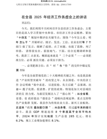 【七哥公文】2025年:【七哥公文】在全县2025年经济工作务虚会上的讲话+更多免费公文+VX:QiGeGongWen2024+更多免费公文+VX:QiGeGongWen2024