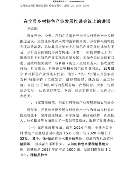 【七哥公文】2025年:【七哥公文】在全县乡村特色产业发展推进会议上的讲话+更多免费公文+VX:QiGeGongWen2024+更多免费公文+VX:QiGeGongWen2024
