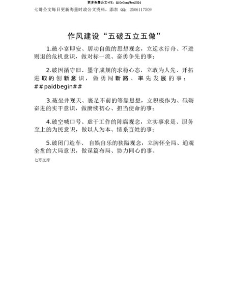【七哥公文】2025年:【七哥公文】作风建设“五破五立五做”+更多免费公文+VX:QiGeGongWen2024+更多免费公文+VX:QiGeGongWen2024