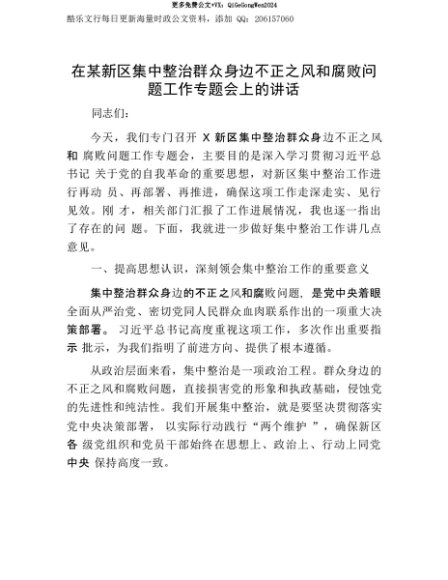 【七哥公文】2025年:【七哥公文】在某新区集中整治群众身边不正之风和腐败问题工作专题会上的讲话+更多免费公文+VX:QiGeGongWen2024+更多免费公文+VX:QiGeGongWen2024