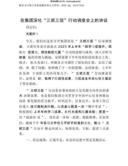 【七哥公文】2025年:【七哥公文】在集团深化“三抓三促”行动调度会上的讲话+更多免费公文+VX:QiGeGongWen2024+更多免费公文+VX:QiGeGongWen2024