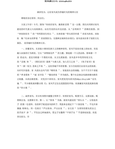 【七哥公文】2025年:【七哥公文】演讲发言:让好家风成为穿越时光的精神火炬+更多免费公文+VX:QiGeGongWen2024+更多免费公文+VX:QiGeGongWen2024