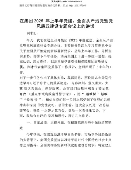 【七哥公文】2025年:【七哥公文】在集团2025年上半年X建、全面从严治X暨X风廉政建设专题会议上的讲话+更多免费公文+VX:QiGeGongWen2024+更多免费公文+VX:QiGeGongWen2024