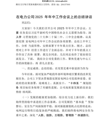 【七哥公文】2025年:【七哥公文】在电力公司2025年年中工作会议上的总结讲话_001+更多免费公文+VX:QiGeGongWen2024+更多免费公文+VX:QiGeGongWen2024