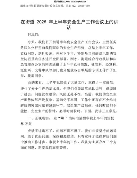 【七哥公文】2025年:【七哥公文】在街道2025年上半年安全生产工作会议上的讲话+更多免费公文+VX:QiGeGongWen2024+更多免费公文+VX:QiGeGongWen2024