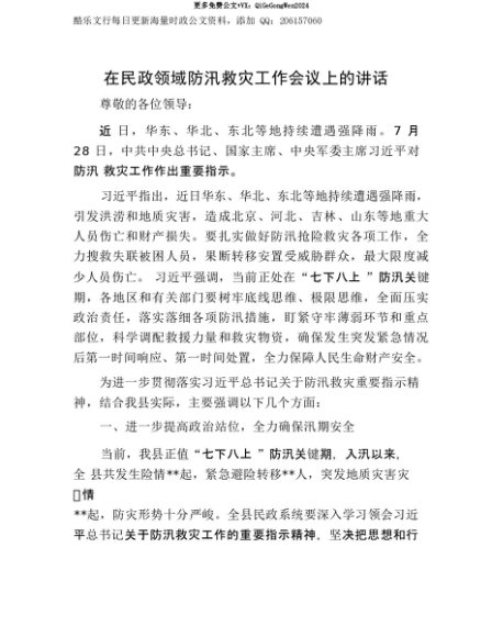 【七哥公文】2025年:【七哥公文】在民政领域防汛救灾工作会议上的讲话+更多免费公文+VX:QiGeGongWen2024+更多免费公文+VX:QiGeGongWen2024
