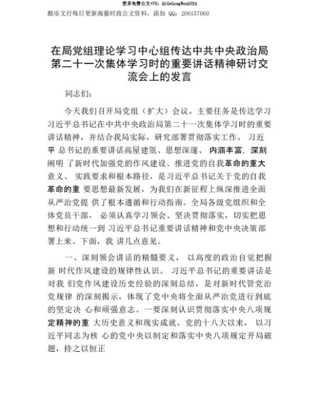 【七哥公文】2025年:【七哥公文】在局X组理论学习中心组传达中共中央ZZ局第二十一次集体学习时的重要讲话精神研讨交流会上的发言+更多免费公文+VX:QiGeGongWen2024+更多免费公文+VX:QiGeGongWen2024