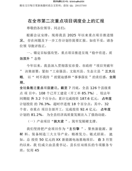 【七哥公文】2025年:【七哥公文】在全市第二次重点项目调度会上的汇报+更多免费公文+VX:QiGeGongWen2024+更多免费公文+VX:QiGeGongWen2024