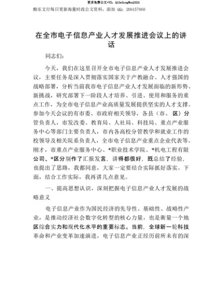 【七哥公文】2025年:【七哥公文】在全市电子信息产业人才发展推进会议上的讲话+更多免费公文+VX:QiGeGongWen2024+更多免费公文+VX:QiGeGongWen2024