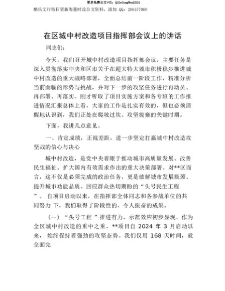 【七哥公文】2025年:【七哥公文】在区城中村改造项目指挥部会议上的讲话+更多免费公文+VX:QiGeGongWen2024+更多免费公文+VX:QiGeGongWen2024