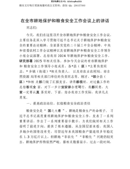 【七哥公文】2025年:【七哥公文】在全市耕地保护和粮食安全工作会议上的讲话+更多免费公文+VX:QiGeGongWen2024+更多免费公文+VX:QiGeGongWen2024
