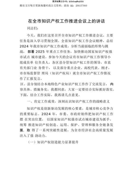 【七哥公文】2025年:【七哥公文】在全市知识产权工作推进会议上的讲话+更多免费公文+VX:QiGeGongWen2024+更多免费公文+VX:QiGeGongWen2024