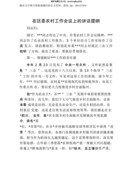 【七哥公文】2025年:【七哥公文】在区委农村工作会议上的讲话提纲+更多免费公文+VX:QiGeGongWen2024+更多免费公文+VX:QiGeGongWen2024