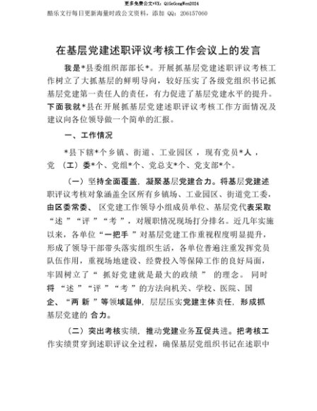 【七哥公文】2025年:【七哥公文】在基层X建述职评议考核工作会议上的发言+更多免费公文+VX:QiGeGongWen2024+更多免费公文+VX:QiGeGongWen2024