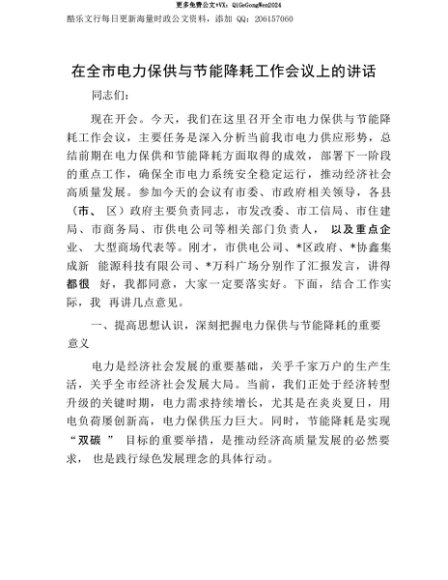 【七哥公文】2025年:【七哥公文】在全市电力保供与节能降耗工作会议上的讲话+更多免费公文+VX:QiGeGongWen2024+更多免费公文+VX:QiGeGongWen2024
