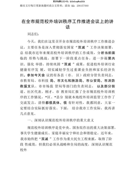 【七哥公文】2025年:【七哥公文】在全市规范校外培训秩序工作推进会议上的讲话+更多免费公文+VX:QiGeGongWen2024+更多免费公文+VX:QiGeGongWen2024