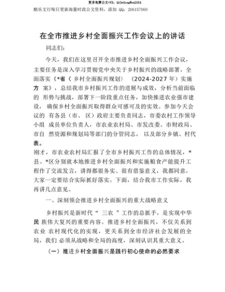【七哥公文】2025年:【七哥公文】在全市推进乡村全面振兴工作会议上的讲话+更多免费公文+VX:QiGeGongWen2024+更多免费公文+VX:QiGeGongWen2024