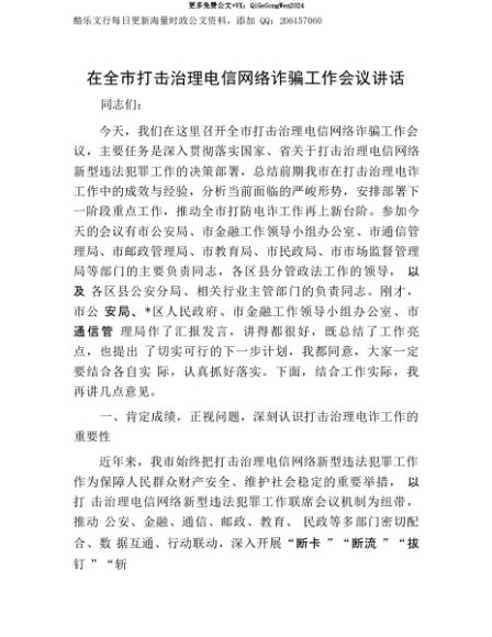 【七哥公文】2025年:【七哥公文】在全市打击治理电信网络诈骗工作会议讲话+更多免费公文+VX:QiGeGongWen2024+更多免费公文+VX:QiGeGongWen2024