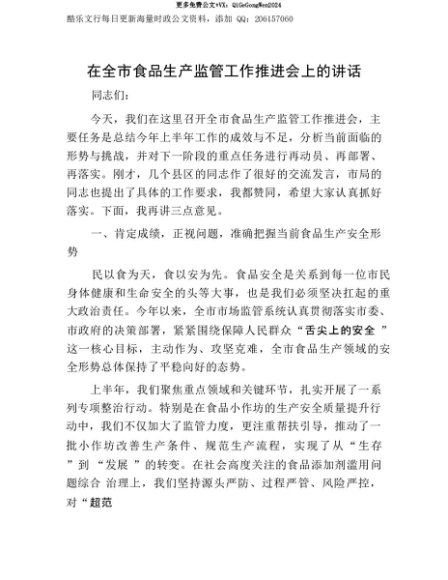【七哥公文】2025年:【七哥公文】在全市食品生产监管工作推进会上的讲话+更多免费公文+VX:QiGeGongWen2024+更多免费公文+VX:QiGeGongWen2024