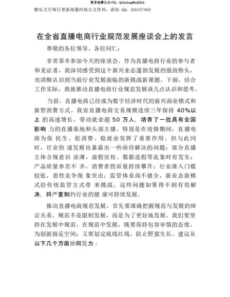 【七哥公文】2025年:【七哥公文】在全省直播电商行业规范发展座谈会上的发言+更多免费公文+VX:QiGeGongWen2024+更多免费公文+VX:QiGeGongWen2024