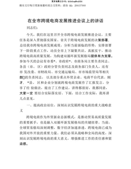 【七哥公文】2025年:【七哥公文】在全市跨境电商发展推进会议上的讲话+更多免费公文+VX:QiGeGongWen2024+更多免费公文+VX:QiGeGongWen2024