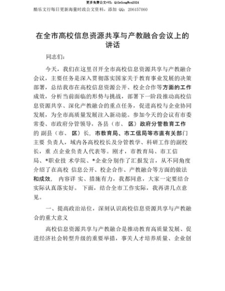 【七哥公文】2025年:【七哥公文】在全市高校信息资源共享与产教融合会议上的讲话+更多免费公文+VX:QiGeGongWen2024+更多免费公文+VX:QiGeGongWen2024