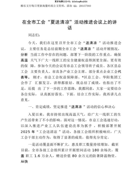 【七哥公文】2025年:【七哥公文】在全市工会“夏送清凉”活动推进会议上的讲话+更多免费公文+VX:QiGeGongWen2024+更多免费公文+VX:QiGeGongWen2024