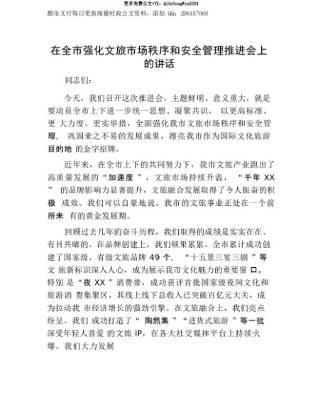 【七哥公文】2025年:【七哥公文】在全市强化文旅市场秩序和安全管理推进会上的讲话+更多免费公文+VX:QiGeGongWen2024+更多免费公文+VX:QiGeGongWen2024