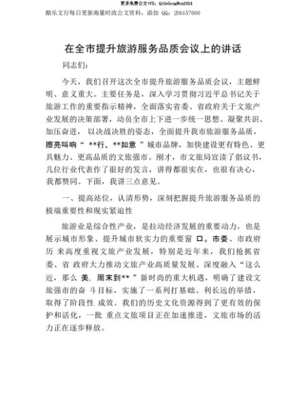 【七哥公文】2025年:【七哥公文】在全市提升旅游服务品质会议上的讲话+更多免费公文+VX:QiGeGongWen2024+更多免费公文+VX:QiGeGongWen2024