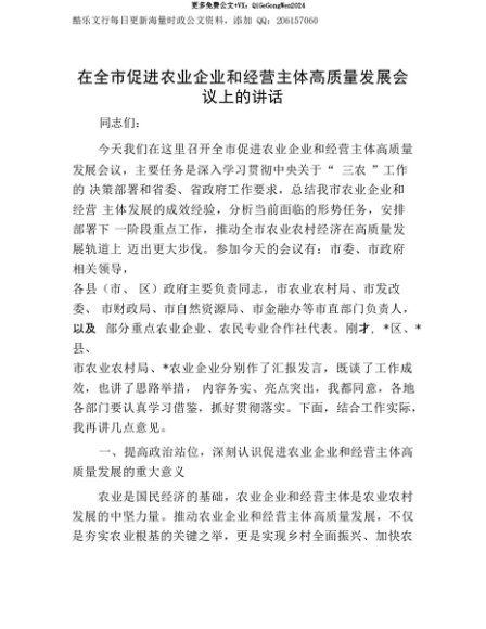 【七哥公文】2025年:【七哥公文】在全市促进农业企业和经营主体高质量发展会议上的讲话+更多免费公文+VX:QiGeGongWen2024+更多免费公文+VX:QiGeGongWen2024