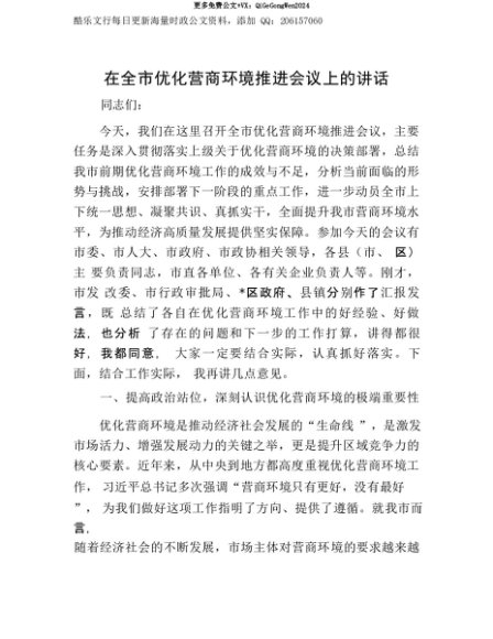 【七哥公文】2025年:【七哥公文】在全市优化营商环境推进会议上的讲话+更多免费公文+VX:QiGeGongWen2024+更多免费公文+VX:QiGeGongWen2024