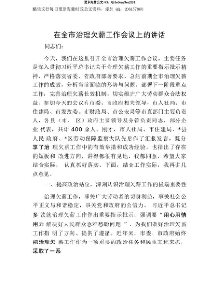 【七哥公文】2025年:【七哥公文】在全市治理欠薪工作会议上的讲话+更多免费公文+VX:QiGeGongWen2024+更多免费公文+VX:QiGeGongWen2024