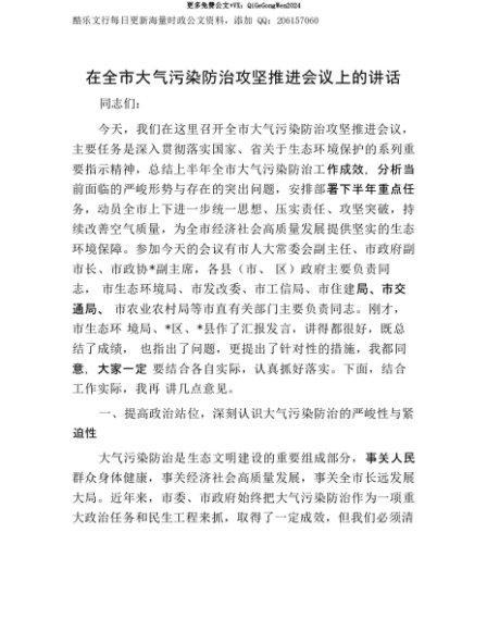 【七哥公文】2025年:【七哥公文】在全市大气污染防治攻坚推进会议上的讲话+更多免费公文+VX:QiGeGongWen2024+更多免费公文+VX:QiGeGongWen2024