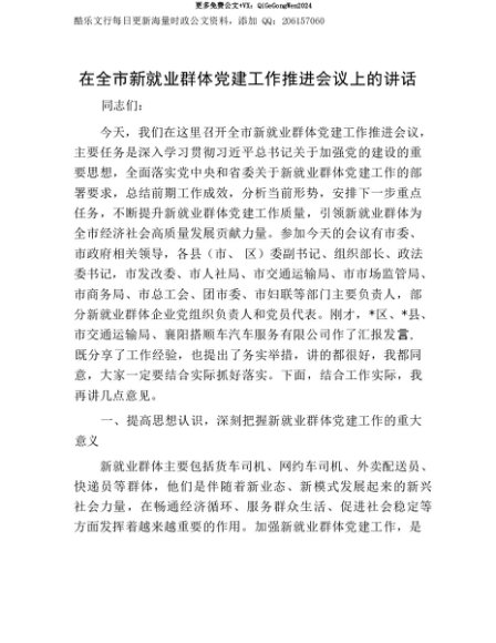 【七哥公文】2025年:【七哥公文】在全市新就业群体X建工作推进会议上的讲话+更多免费公文+VX:QiGeGongWen2024+更多免费公文+VX:QiGeGongWen2024