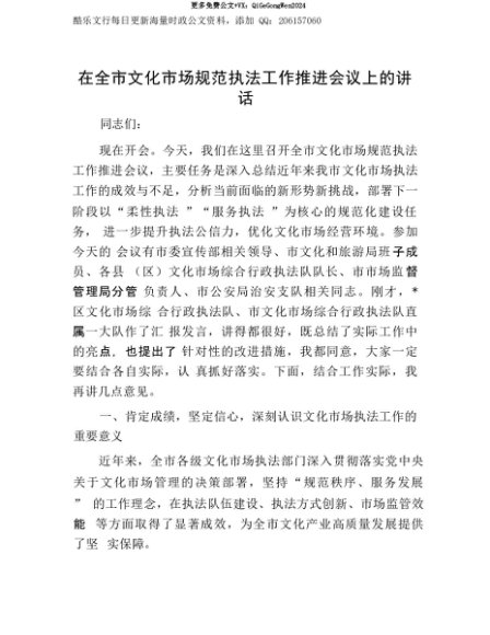 【七哥公文】2025年:【七哥公文】在全市文化市场规范执法工作推进会议上的讲话+更多免费公文+VX:QiGeGongWen2024+更多免费公文+VX:QiGeGongWen2024