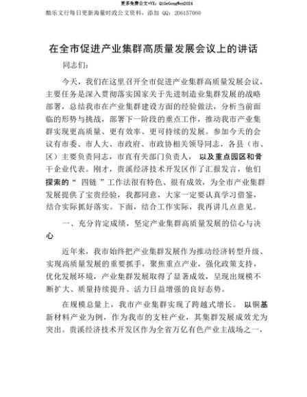 【七哥公文】2025年:【七哥公文】在全市促进产业集群高质量发展会议上的讲话+更多免费公文+VX:QiGeGongWen2024+更多免费公文+VX:QiGeGongWen2024