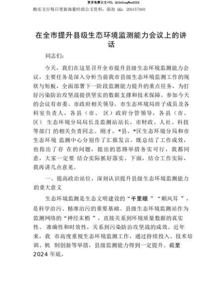 【七哥公文】2025年:【七哥公文】在全市提升县级生态环境监测能力会议上的讲话+更多免费公文+VX:QiGeGongWen2024+更多免费公文+VX:QiGeGongWen2024