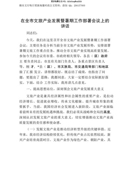 【七哥公文】2025年:【七哥公文】在全市文旅产业发展暨暑期工作部署会议上的讲话+更多免费公文+VX:QiGeGongWen2024+更多免费公文+VX:QiGeGongWen2024