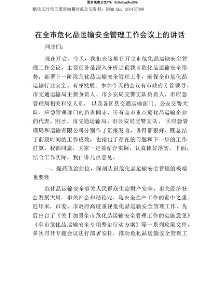 【七哥公文】2025年:【七哥公文】在全市危化品运输安全管理工作会议上的讲话+更多免费公文+VX:QiGeGongWen2024+更多免费公文+VX:QiGeGongWen2024