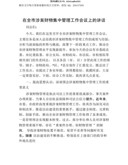 【七哥公文】2025年:【七哥公文】在全市涉案财物集中管理工作会议上的讲话+更多免费公文+VX:QiGeGongWen2024+更多免费公文+VX:QiGeGongWen2024