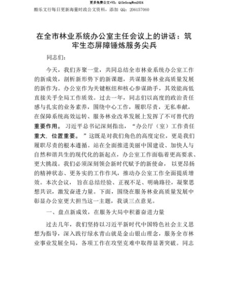 【七哥公文】2025年:【七哥公文】在全市林业系统办公室主任会议上的讲话:筑牢生态屏障 锤炼服务尖兵+更多免费公文+VX:QiGeGongWen2024+更多免费公文+VX:QiGeGongWen2024