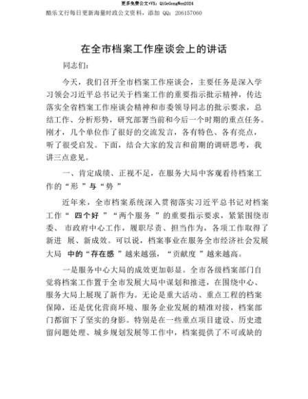 【七哥公文】2025年:【七哥公文】在全市档案工作座谈会上的讲话+更多免费公文+VX:QiGeGongWen2024+更多免费公文+VX:QiGeGongWen2024